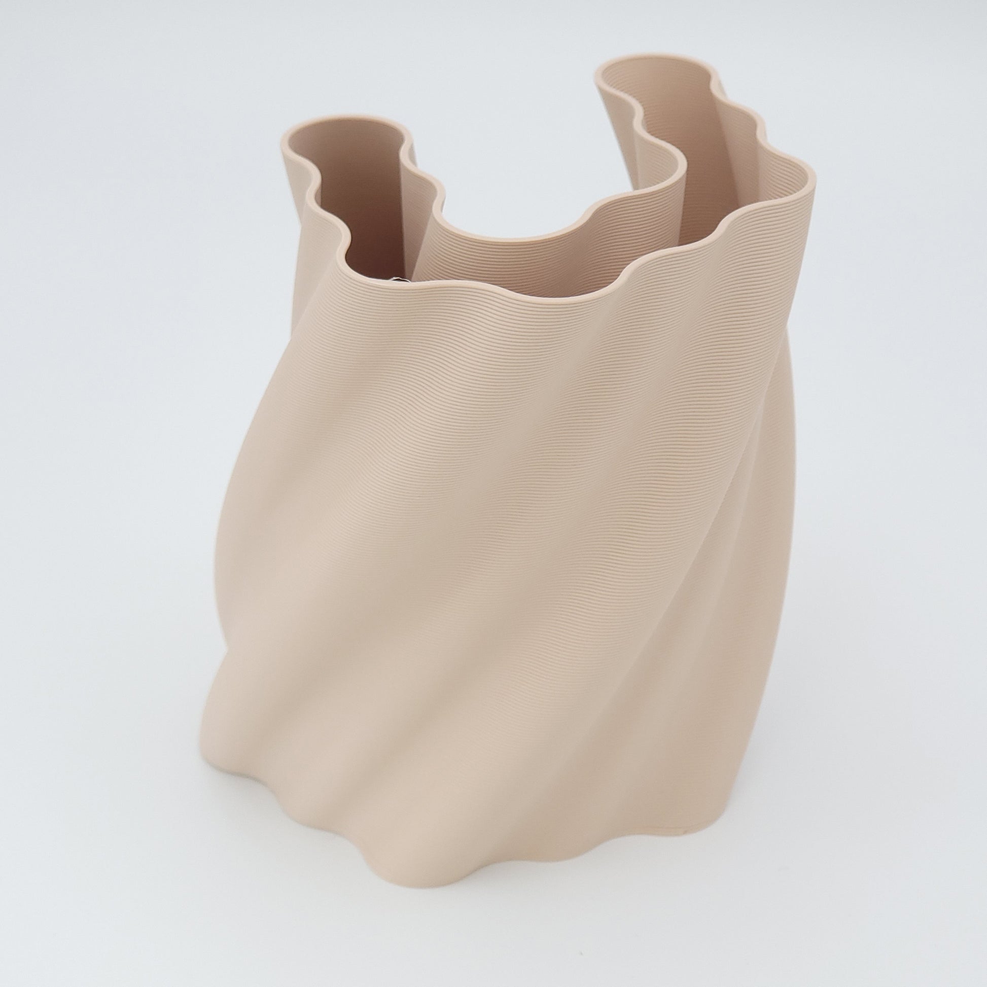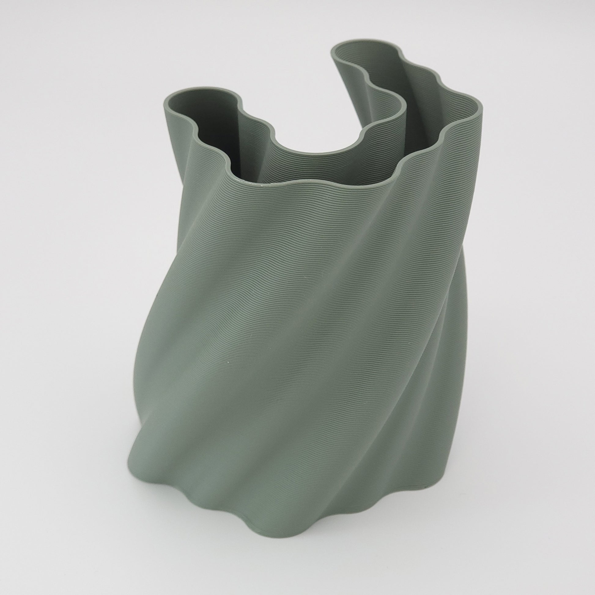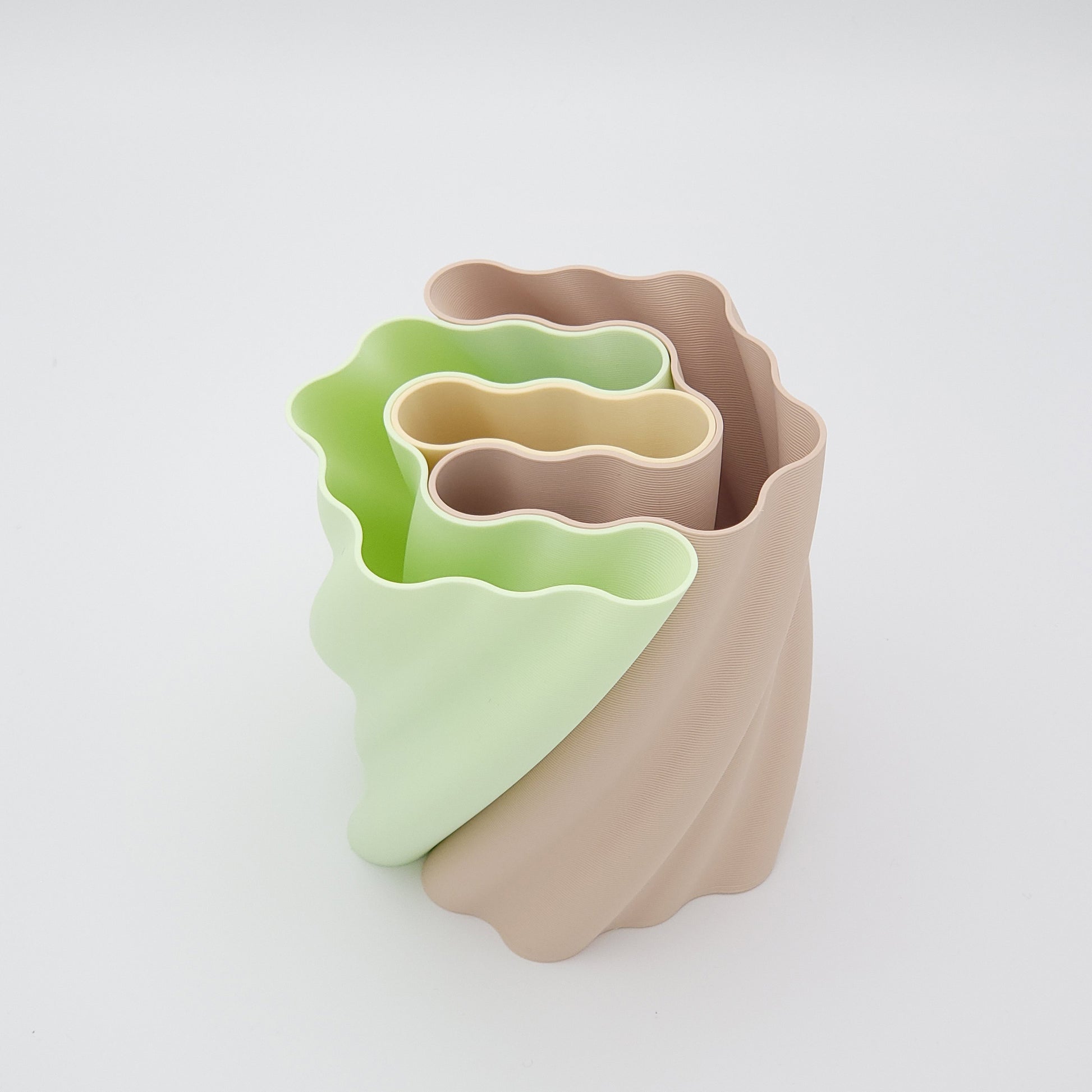 Ce pot à crayons est constitué de trois parties : deux parties principales (de forme parfaitement identique) imbriquées de teinte vert foncé, vert clair ou beige et une partie centrale couleur crème.