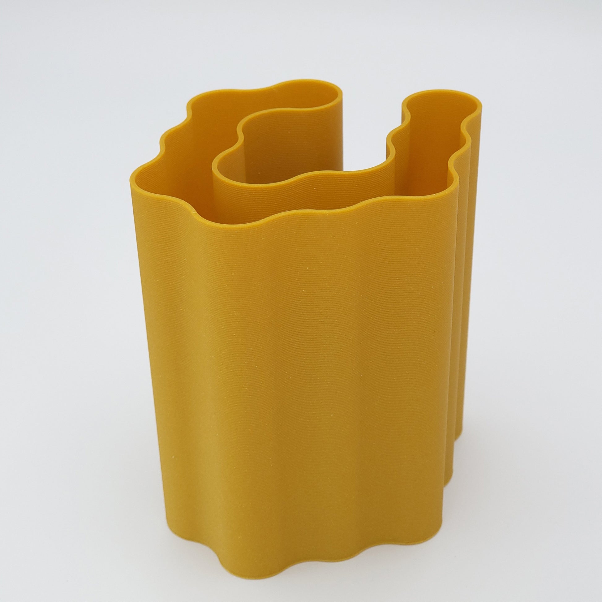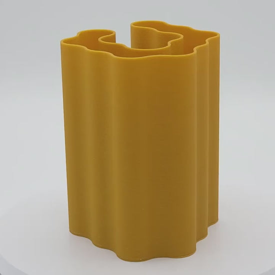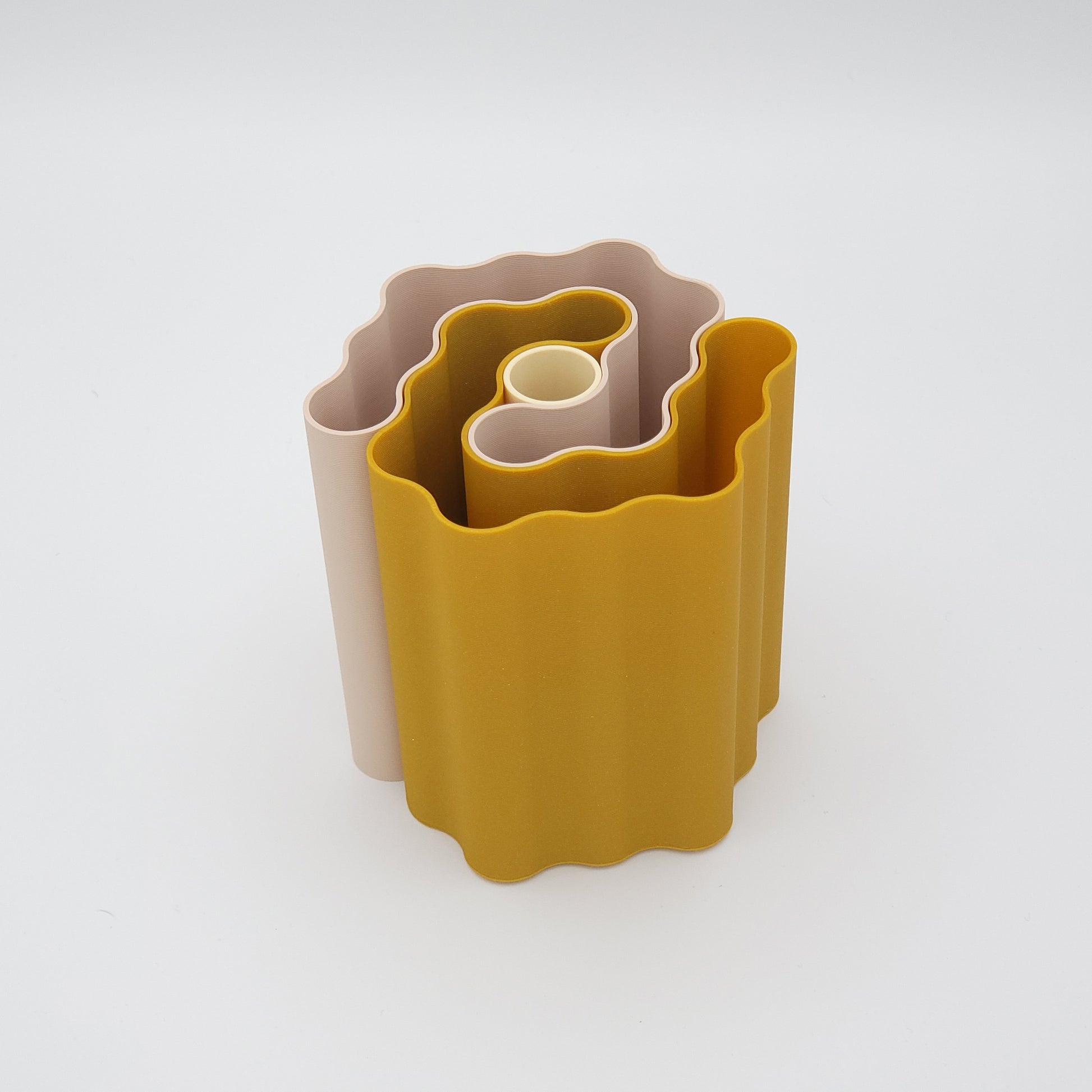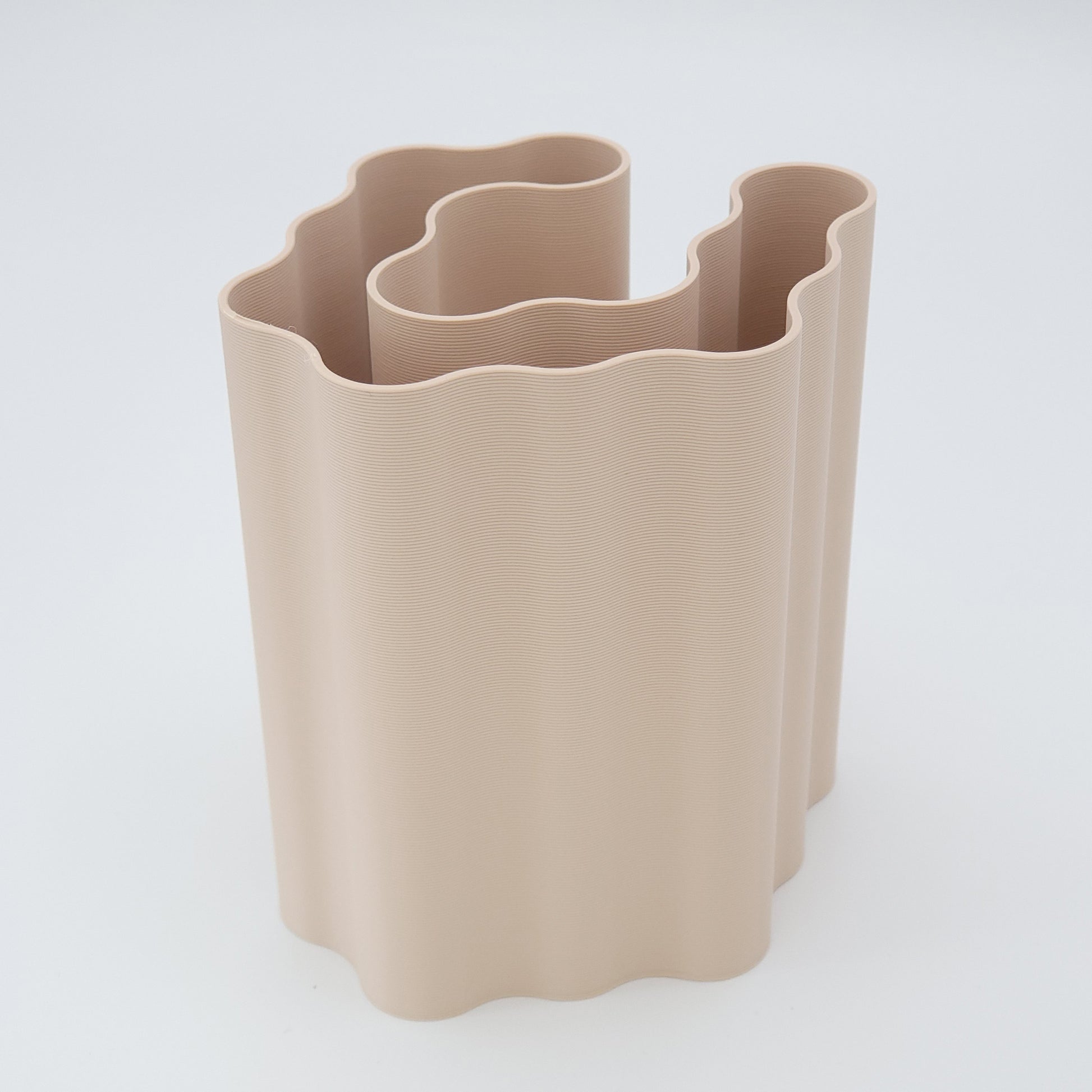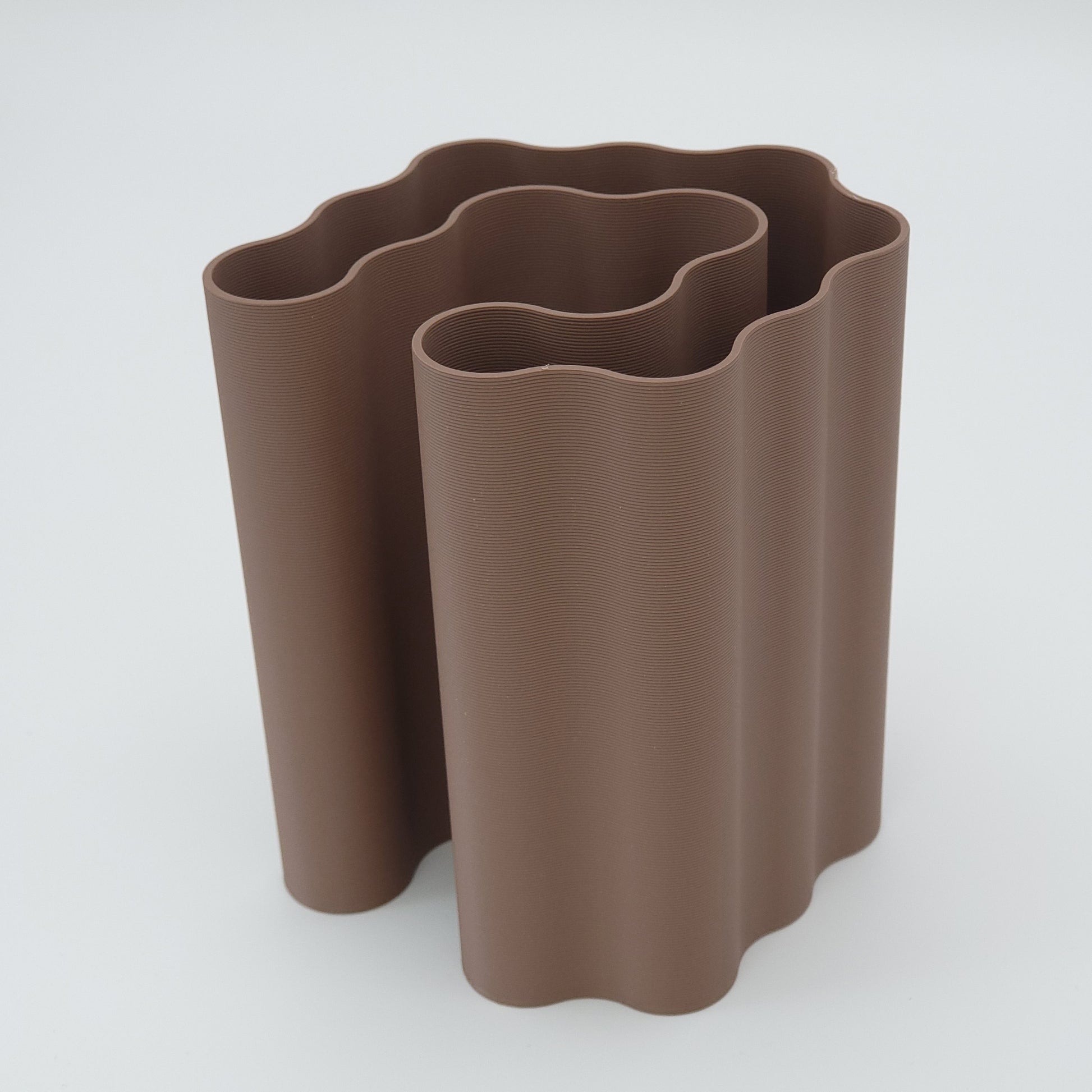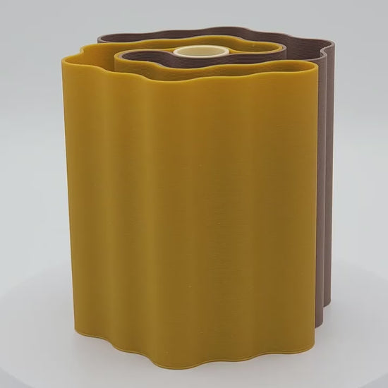 Ce pot à crayons est constitué de trois parties : deux parties principales (de forme parfaitement identique) imbriquées de teinte marron, beige ou or et une partie centrale couleur crème.