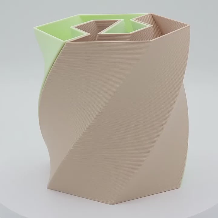 Ce pot à crayons est constitué de deux parties (de forme parfaitement identique) imbriquées, de couleur vert foncé, vert clair, ou beige.