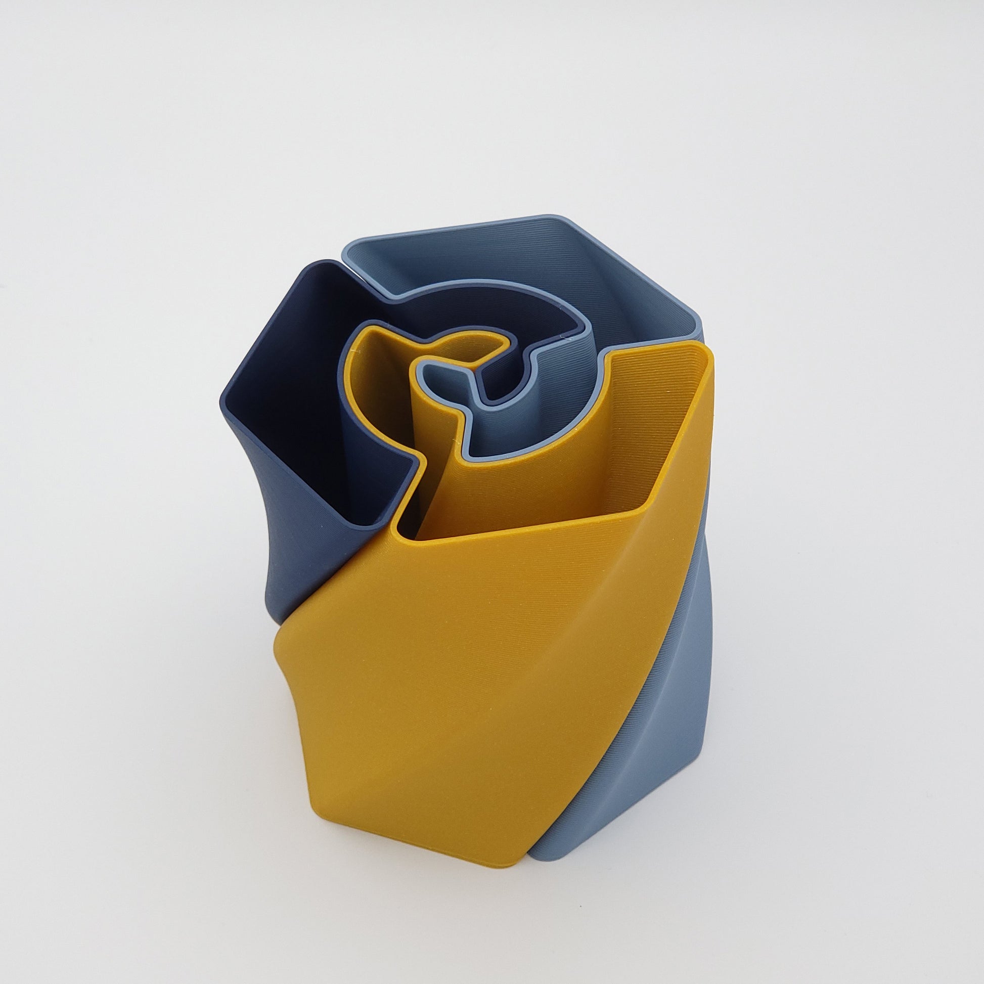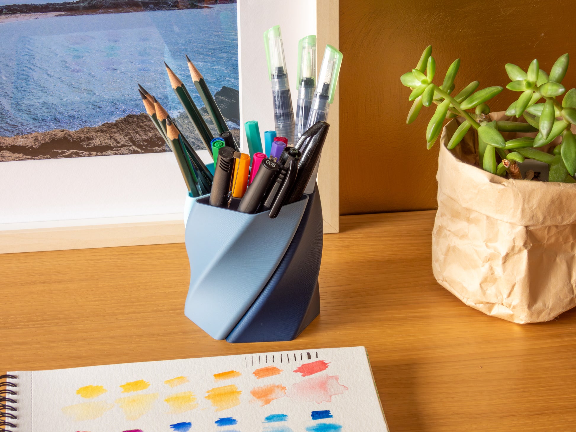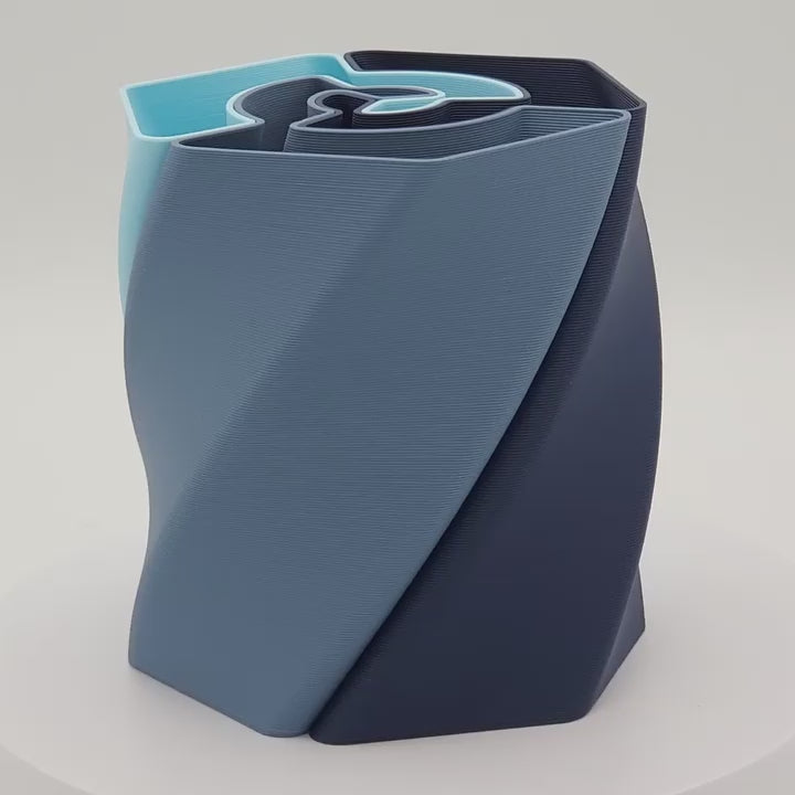 Sa forme en deux niveaux torsadés permet d'avoir un effet "éventail" du plus bel effet sur les crayons et permet à la lumière d'apporter un fascinant dégradé de couleur d'une grande élégance. Attention toutefois, cette forme diminue légèrement la contenance du pot.