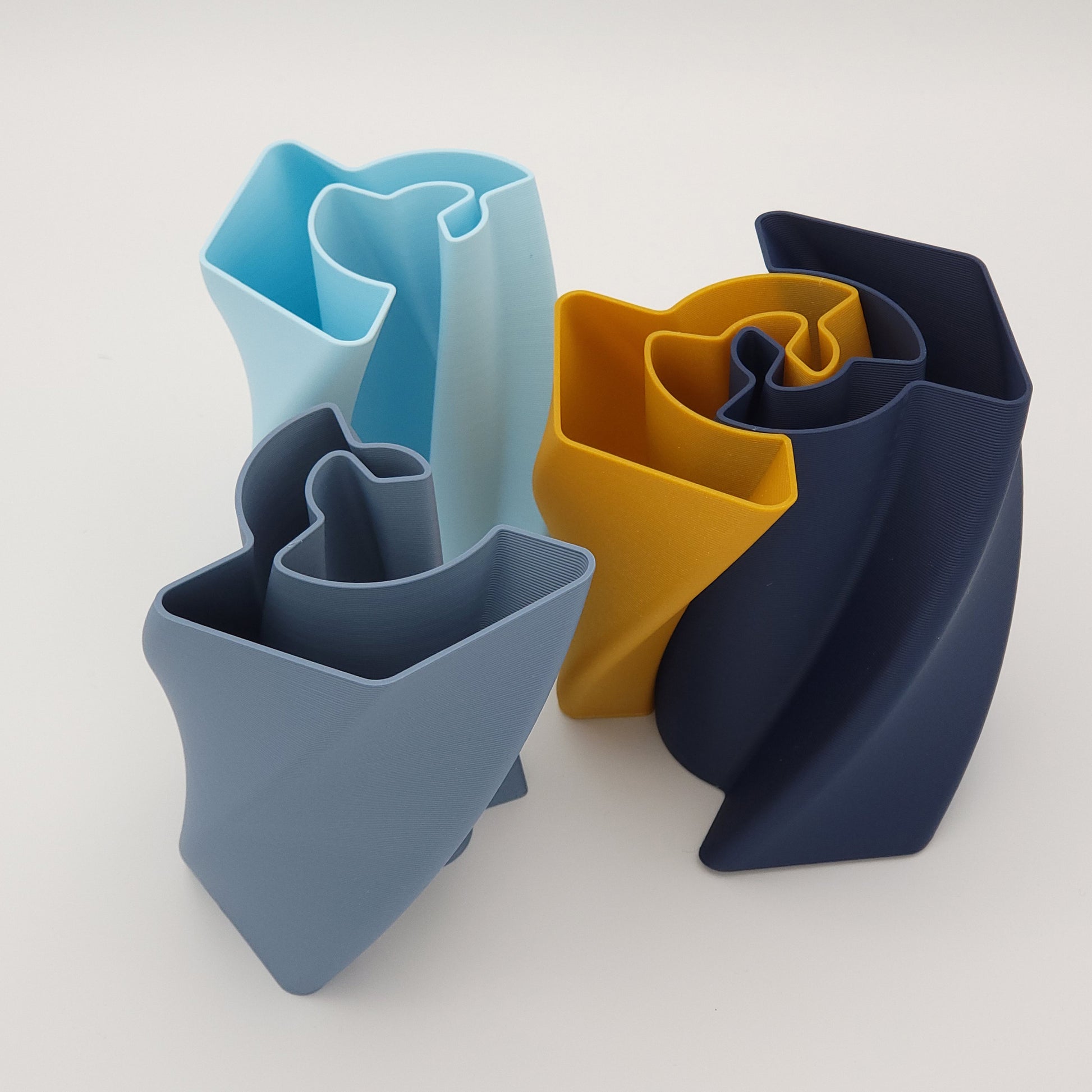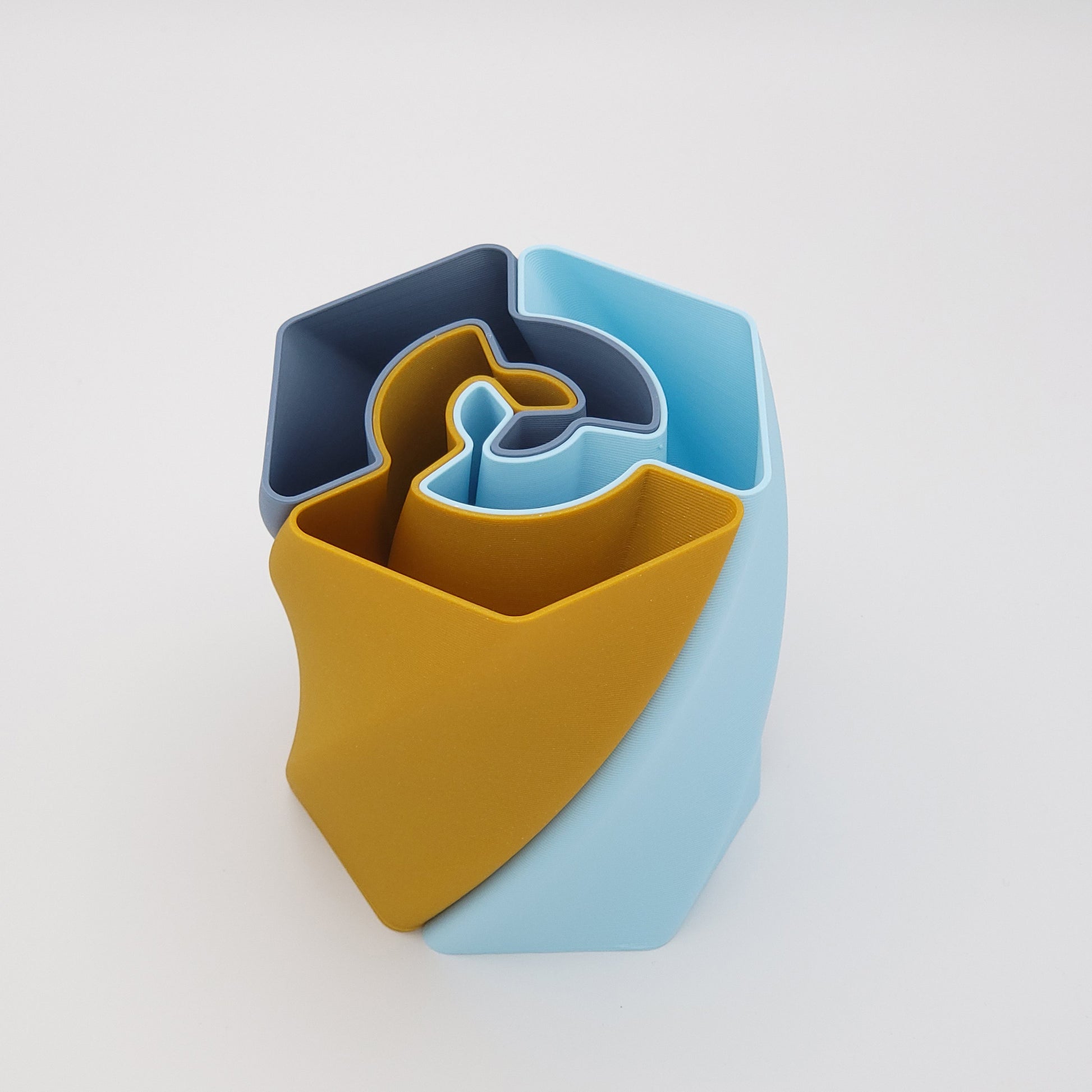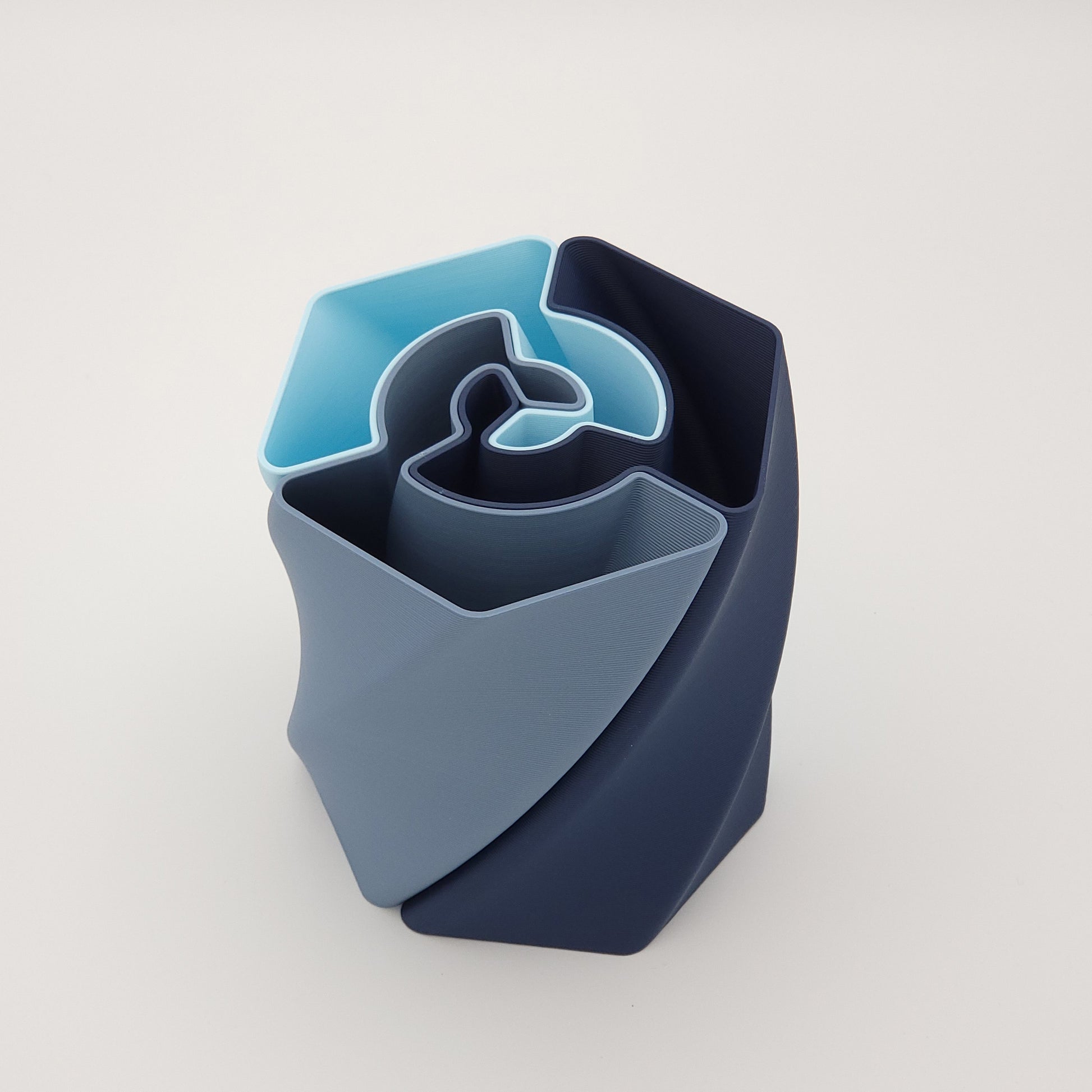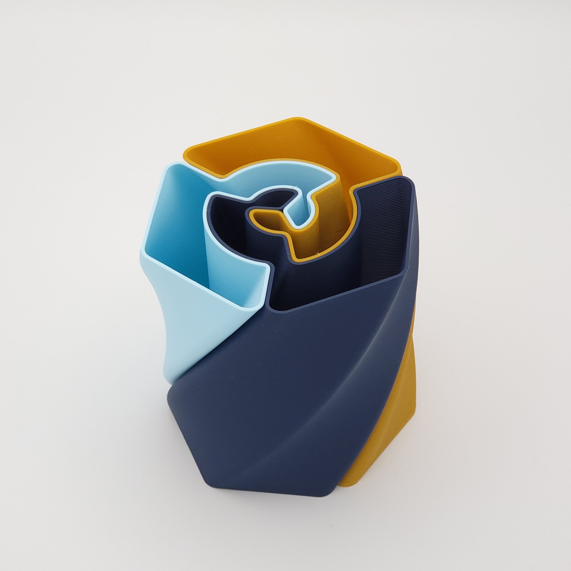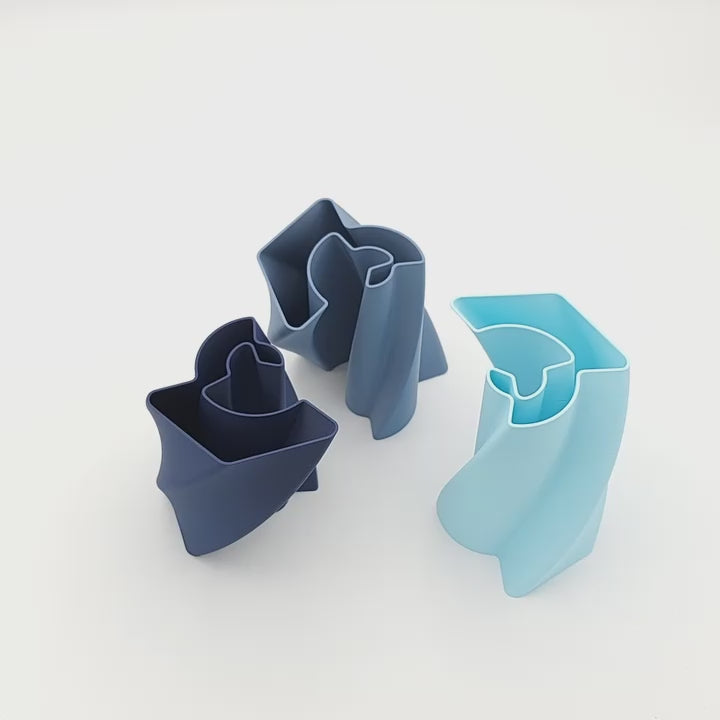 Ce pot à crayons est constitué de trois parties (de forme parfaitement identique) imbriquées, de couleur bleu marine, bleu gris, bleu glacier ou or.